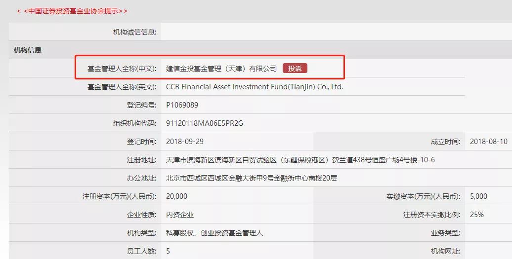 協(xié)會(huì)備案信息顯示,建信金投基金管理(天津)有限公司(簡(jiǎn)稱(chēng)“建信金投基金”)成立于2018年8月10日,隨后于9月29日就在中國(guó)證券投資基金業(yè)協(xié)會(huì)完成私募基金管理人登記。